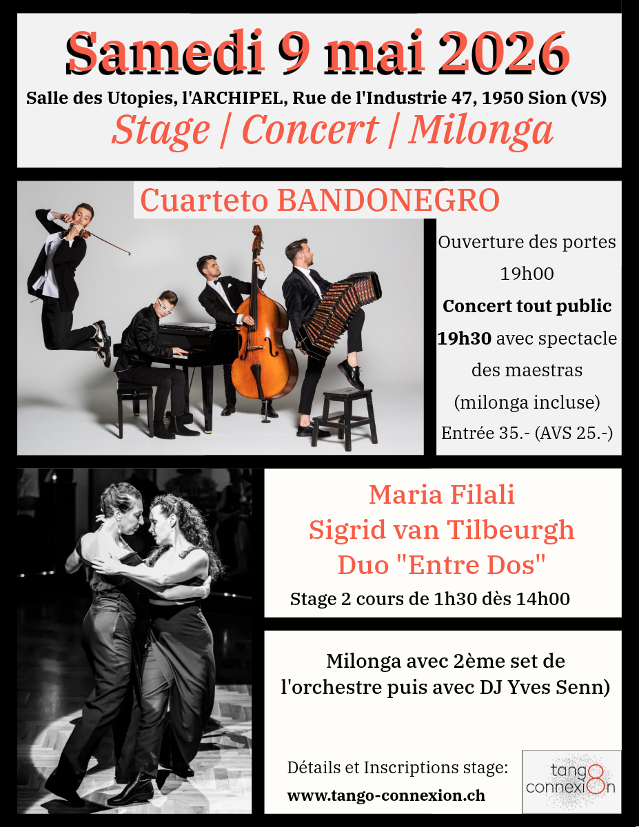 20h45 - 21h30 - 2ème partie du concert: pour cette partie, nous déplacerons les chaises et pratiquerons un espace au milieu de la salle, afin que les danseurs de tango argentin présents puissent danser sur la musique live de l'orchestre. Cette partie vous fera voyager dans l'ambiance des cafés et dancings de Buenos Aires ("milongas").